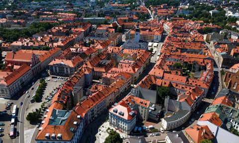 Kalisz , centrum miasta otoczone fragmentami murów obronnych .