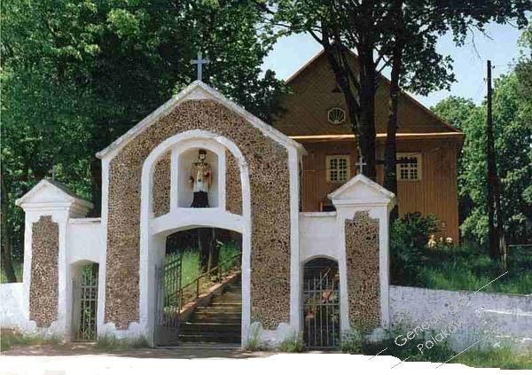 Makarowce - Opis tego miejsca - Wejście do kościoła p.w. Podwyższenia Krzyża Świętego, poświęconego dnia 24 czerwca 1795 roku. Fundatorem kościoła był Marszałek Szlachty Grodzieńskiej Ludwik Pancerzyński i jego małżonka Konstancja ze Skirmuntów. Opis kościoła