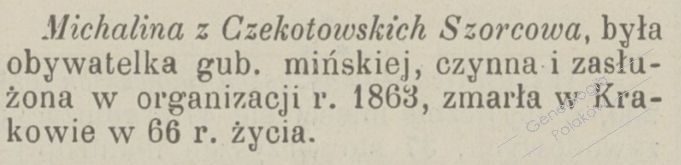 Michalina z Czekotowskich Szorcowa, była obywatelka gub. mińskiej, czynna i zasłużona w organizacji r. 1863, zmarła w Krakowie w 66 r. życia.