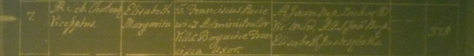 Wycinek księgi urodzin z parafi św. Mikołaja Biskupa w Bochni dot. urodzin w dniu 7.07.1778 r. Elżbiety Małgorzaty Pacewicz, córki Franciszka, Administratora wsi Bogucice i Franciszki Jastrzębskiej h. Ślepowron c. Aleksandra i Elżbiety Zacharskiej