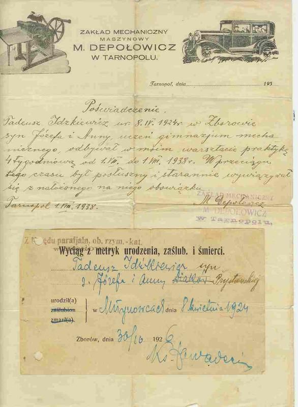 Wyciąg z metryki urodzenia /Młynowce/ oraz poświadczenie odbycia praktyki zawodu/Tarnopol/- Tadeusza Idzkiewicza