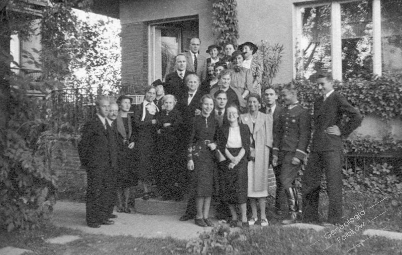 Od lewej: Józef Juszkiewicz, Włodzimierz Juszkiewicz, Wanda Zajączkowska (Wąsowska), Rozalia z Łunkiewiczów Lebiedzińska, w kapeluszu - NN, Katarzyna z Zajączkowskich Rogowska, Adam Suzin, Mieczysław Rogowski. Od prawej: Andrzej Kosiński, Mieczysław Lebiedziński, Jan Zajączkowski, Hanna Kosińska (Fall), Janina Juszkiewicz (Krzemińska), Henryk Zajączkowski, nad nim: Wanda z Zajączkowskich Pierścińska, zasłonięta: Maria z Eysymontów Zajączkowska, zasłonięta bez kapelusza: Stanisława z Michniowskich Juszkiewicz, w kapeluszu: Józefa z Suzinów Kosińska, , na samej górze: NN, NN (Janina Doroszewska?), NN, na dole obok Janiny Juszkiewicz: Danuta z Suzinów Jankowska.
