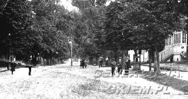 Jedno z najstarszych zachowanych zdjęć. Rok 1908, ulica Pałacowa (taką nazwę nosi też obecnie). W głębi widać dwa sfinksy (zachowane do dzisiaj)- resztki bramy do riun pałacu Anny Księżnej Jabłonowskiej. Istnieją do dzisiaj widniejące z prawej strony budynki.