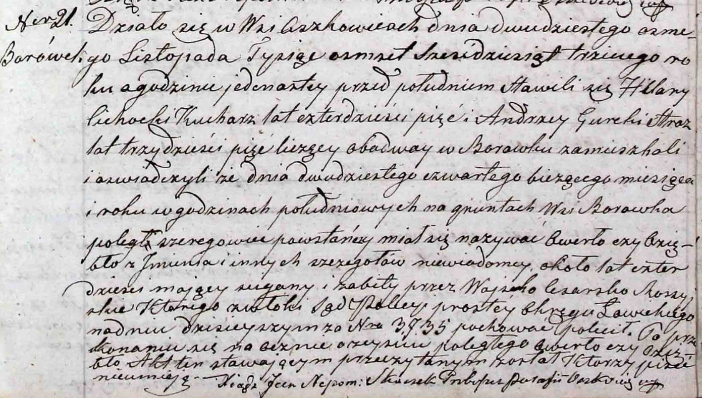 Szeregowy powstaniec styczniowy, lat ok. 40, poległy 24,.11.1863 r na gruntach wsi Borówek w parafii Oszkowice [obecnie Gmina Bielawy, powiat łowicki, woj. łódzkie], zabity przez Wojska Rosyjskie, pochowany na polecenie Sądu.