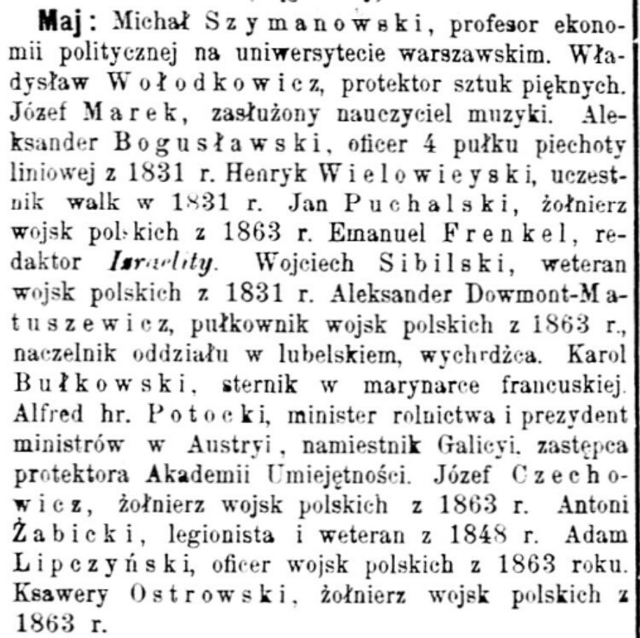 Michał Szymanowski Władysław Wołodkowicz Józef Marek Aleksander Bogusławski - powstaniec 1831 Henryk Wielowiejski - powstaniec 1831 Jan Puchalski - powstaniec 1863 Emanuel Frenkel Wojciech Sibilski - powstaniec 1831 Aleksander Dowmont-Matuszewicz - pułkownik wojsk polskich w 1863, naczelnik oddziału w lubelskim, emigrant Karol Bułkowski Alfred Potocki Józef Czechowicz - żołnierz wojsk polskich w 1863 Antoni Żabicki, legionisty, weteran 1848 Adam Lipczyński - powstaniec 1863 Ksawery Ostrowski - powstaniec 1863