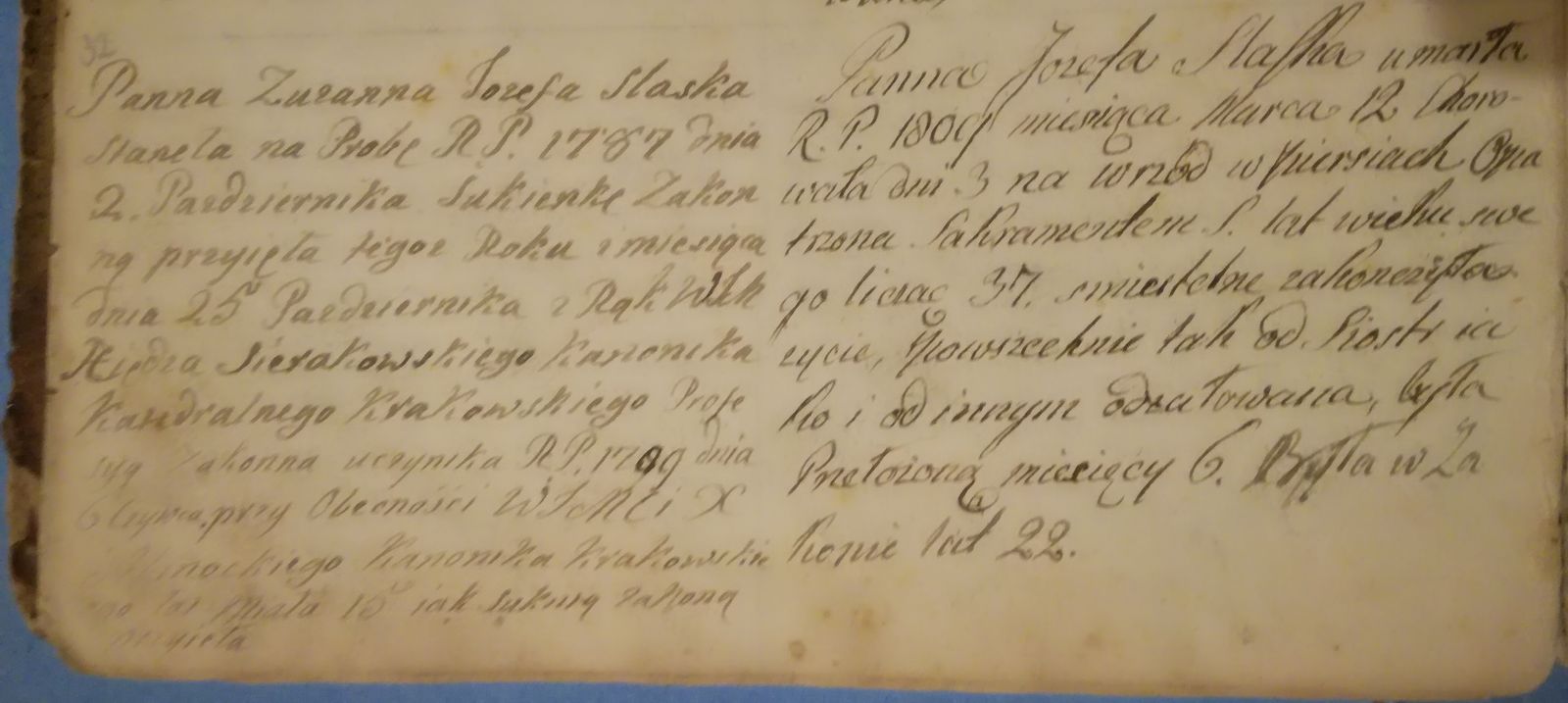 Opis wstąpienia do zakonu i profesji Sióstr Zgromadzenia od Ofiarowania Maryi Panny, tudzież zejścia z tego świata tychże sióstr od roku 1698, w: Archiwum Zgromadzenia ss. Prezentek w Krakowie (AZSPK)