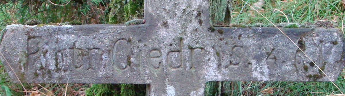 Napis na krzyżu: Piotr Giedryś, cmentarz jeniecki z okresu I Wojny Światowej