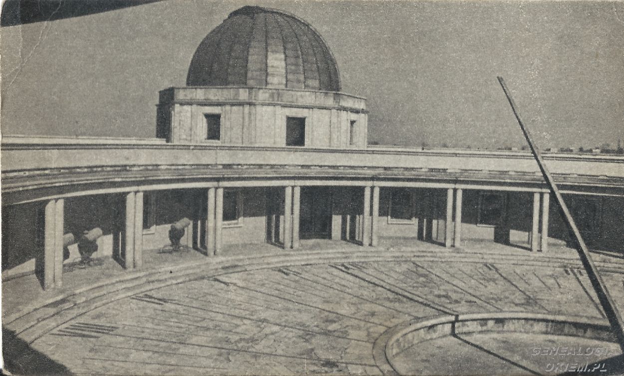 Planetarium i Obserwatorium Astronomiczne im. M.Kopernika. Dziedziniec z zegarem słonecznym, w głębi kopuła obserwatorium astronomicznego